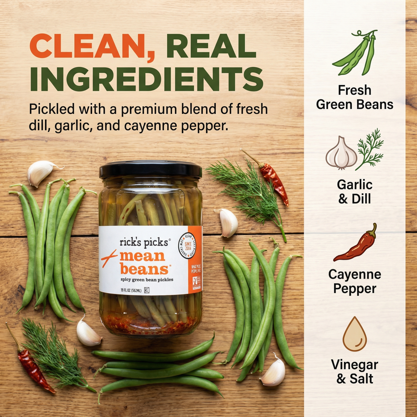 Ingredients: green beans, water, acetic acid, salt, garlic, dill, cayenne pepper
